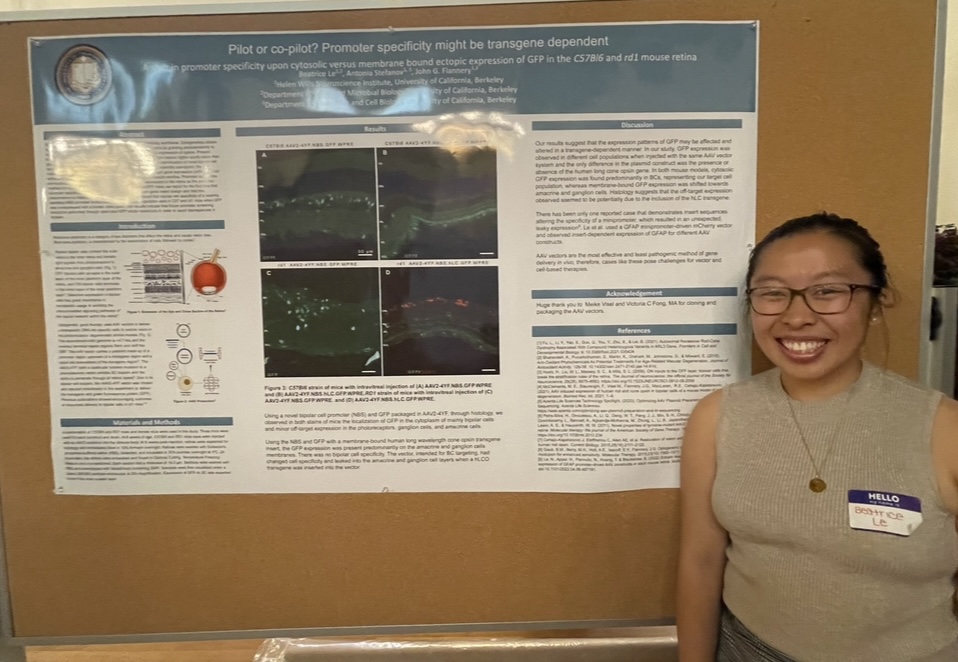 Pilot or co-pilot? Promoter specificity might be transgene dependent A shift in promoter specificity upon cytosolic versus membrane-bound ectopic expression of GFP in the C57Bl6 and rd1 mouse retina. Bay Area Vision Research Day (BAVRD) Conference (Poster). Berkeley, CA. September 9th, 2022.